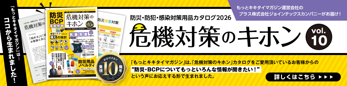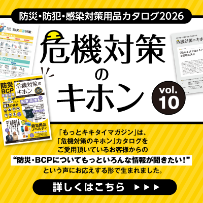 新着コラム 感震ブレーカーは後付けできる?種類・費用・導入方法を解説 2025.12.19 企業が取り組むべき万引き対策とは?効果的な防止策と組織的な取り組みを解説 2025.12.12 事務所荒らしの手口と対策|狙われやすいオフィスの特徴と防犯のポイント 2025.12.05 感震ブレーカーは後付けできる?種類・費用・導入方法を解説 防災対策 2025.12.19 企業が取り組むべき万引き対策とは?効果的な防止策と組織的な取り組みを解説 防犯 2025.12.12 コラム一覧はこちら → 対談インタビュー 対談インタビューはこちら → 採用事例 採用事例はこちら → お役立ち資料 お役立ち資料一覧はこちら → ピックアップ商品/サービス 貼るだけ防犯!窓ピタッアラーム 【こんなお客様におススメ】 ✔ 防犯対策を簡単に行いたい ✔ 誤検知による警報を少なくしたい ✔ 扱いやすいサイズ感のものが欲しい あらゆる災害への備えに!耐切創タイプと防水・防寒タイプグローブのすすめ 【こんなお客様におススメ】 ✔ 発災後の復旧作業を安全に行いたい ✔ 避難場所での水場作業負担を減らしたい ✔ 備蓄品の軍手をより良いものに交換したい 商品/サービス一覧はこちら → カテゴリから選ぶ その他、外部お役立ちサイト <運営元> 内閣府政策統括官 全国各地で行われている防災イベントの紹介、防災に関連するニュース・資料の提供などをしています。 <運営元> 国土交通省 災害リスク情報などを地図に重ねて表示、確認できます。各自治体作成のハザードマップ閲覧も可能です。 <運営元> 防災科学技術研究所 将来日本で発生する恐れのある地震による強い揺れを予測し、予測結果を地図上で表示、確認できます。 ページトップへ サイト内検索 みんなが「キキタイ!」 サイト内閲覧数ランキング