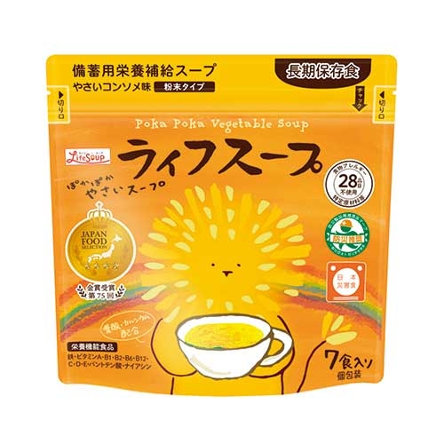 惣菜やスープ類、主食となるご飯類や麺類など、お湯または水を入れるだけで完成する食品です。商品によって賞味期限は異なりますが、一般的に3年から5年程度の長期保存が可能です。
